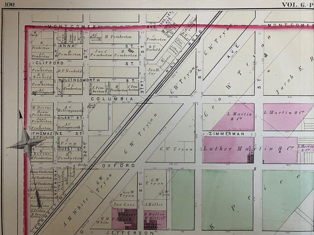 Features a number of the neighborhood's early breweries including Rothacker Brewing, Goldbeck & Eisele, J&P Baltz. Shows 33rd St, Montgomery Ave, 23rd St, and Thompson St.