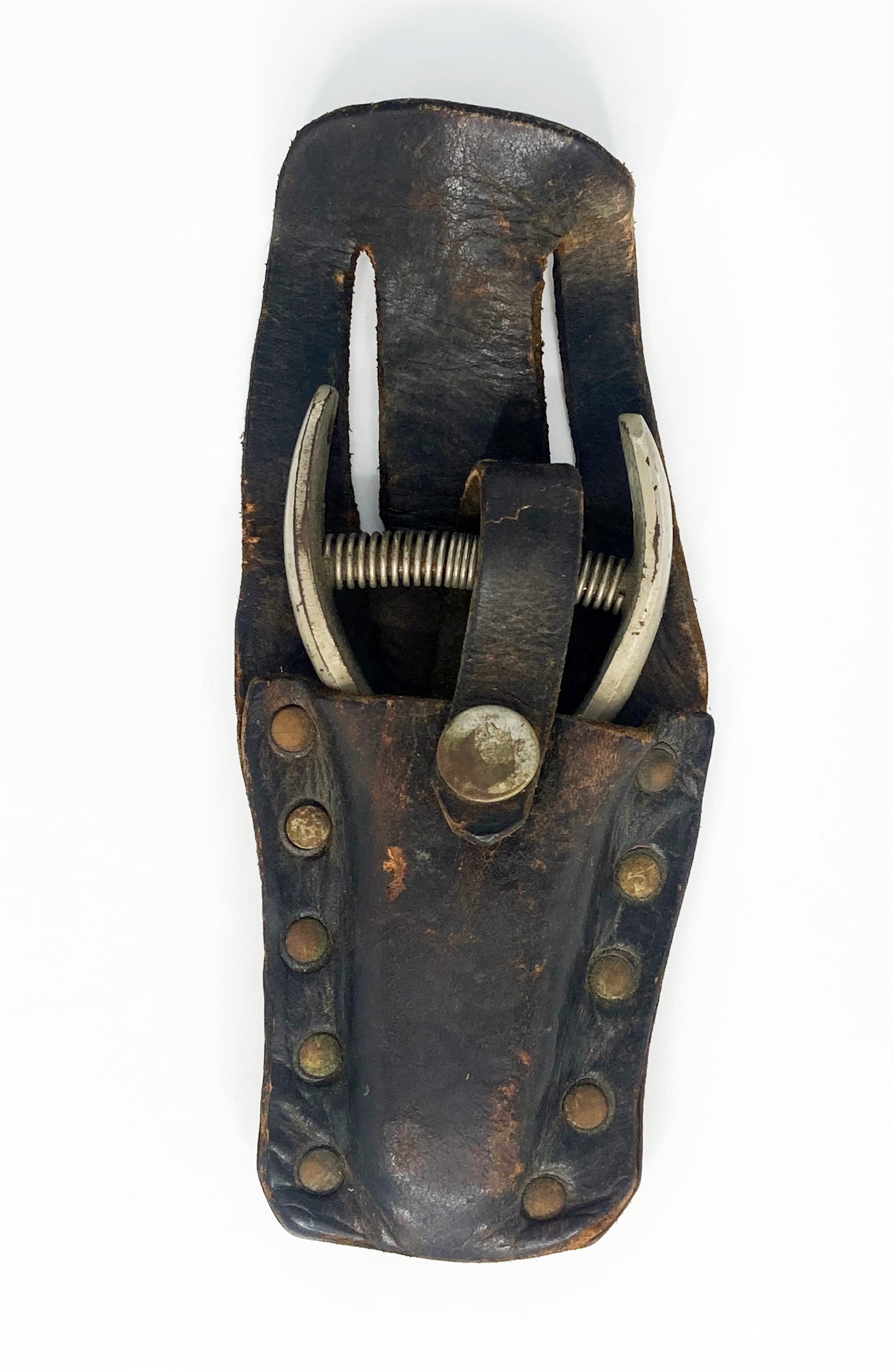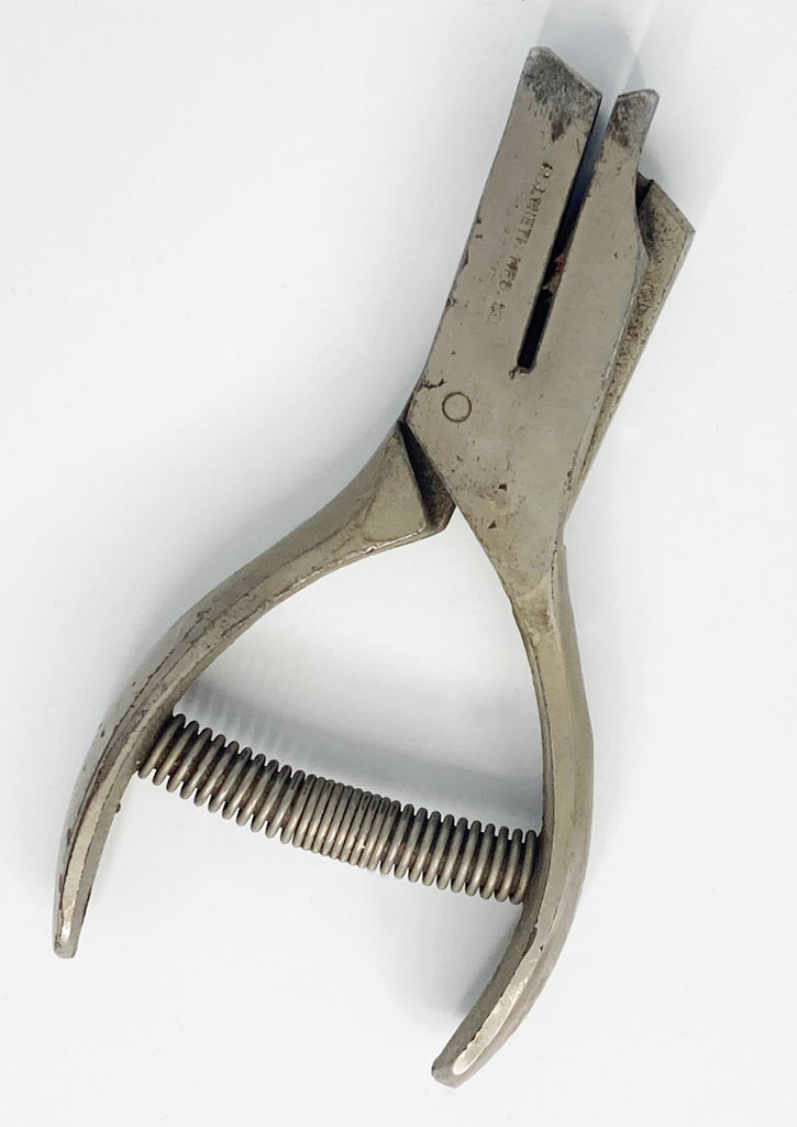 Heavy duty Philadelphia Transit Company ticket punch and studded leather carry pouch or holster ca. 1950s. "P.T.C" is engraved on the side of the punch. The tool would have been used by the conductor/driver on PTC trolley and bus routes. 3/16 round shaped Die. Punch tool measures 4.75" overall.