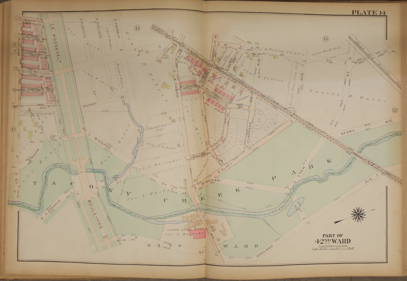 Shows the area between Ruscomb Street, Garland Avenue, and Elliot Street. This map features the Cedar Grove Mills. This area used to be lush with vegetation, and in this map, it is only just beginning to be developed.
