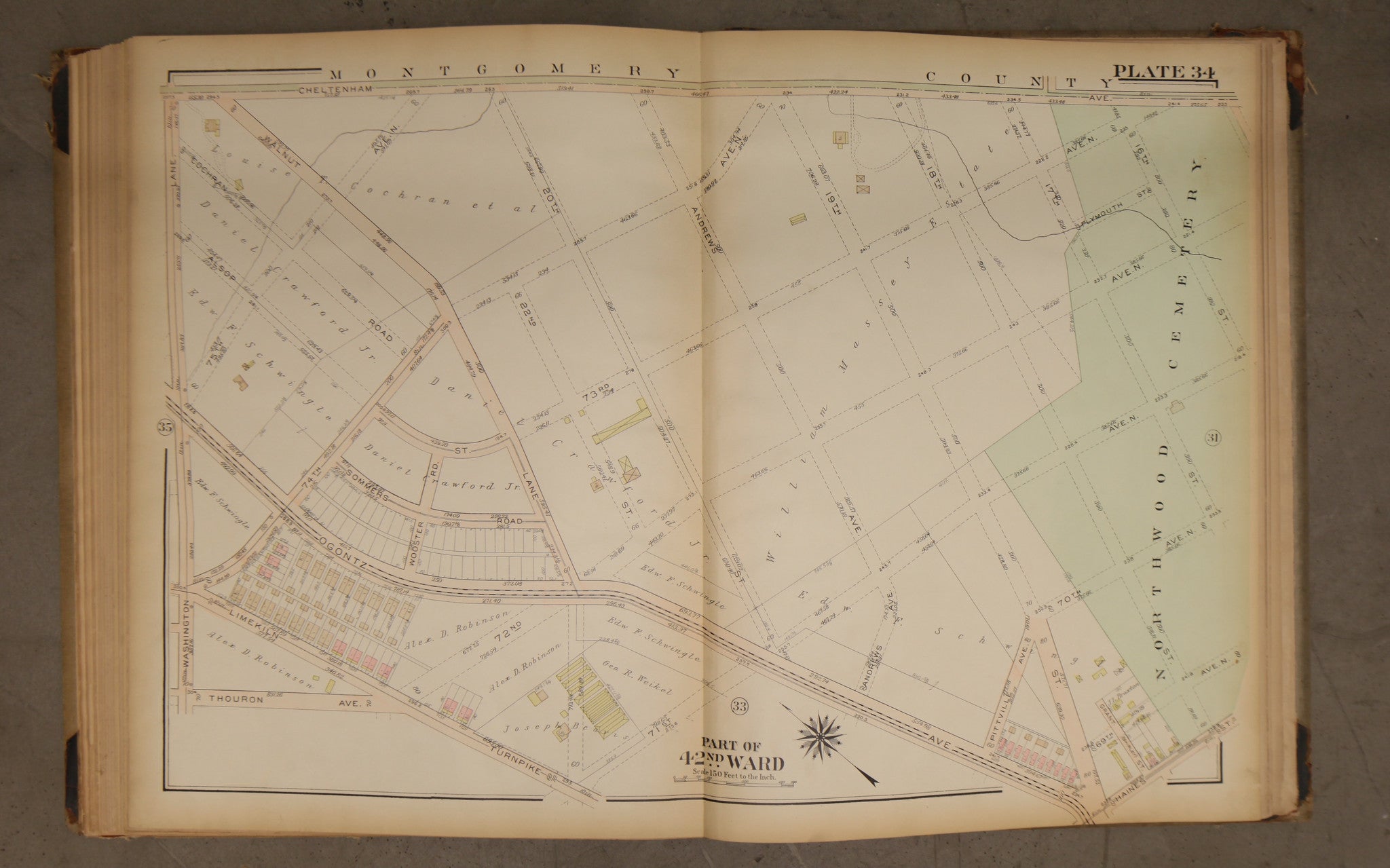 Big, beautiful and original! 23 by 33 linen map of the 42nd Ward between Washington Lane to Northwood Cemetery, and from Limekiln Turnpike to Cheltenham Avenue. This map shows the western extent of Northwood Cemetery and the undeveloped land next to it (now residential land).
